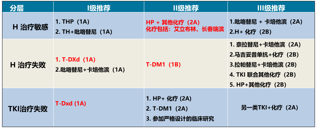 基于DESTINY-Breast03研究,T-DXd理所应当地获得了《CSCO BC指南2025》对于H治疗失败后的最高级别推荐,即Ⅰ级推荐(1A)。又因DESTINY-Breast03研究纳入了部分TKI经治患者,结合国内临床诊疗经验的积累,《CSCO BC指南2025》对于TKI治疗失败人群也Ⅰ级推荐了T-DXd(1A)(图2)。新药的发展在指南中得以呈现,推动了治疗格局的变化,使抗HER2 ADC在二线应用的地位愈加稳固,在临床实践的应用愈加广泛。