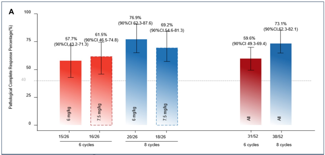 该研究入组人群为II至III期疾病的HER2阳性乳腺癌患者,随机接受TQB2102新辅助治疗,剂量为每3周6mg/kg或7mg/kg,共6个周期(A组)或8个周期(B组)。当然,徐瑞华教授汇报的1期剂量爬坡研究中,6mg/kg和7.5mg/kg都是可行的剂量方案。总体来看,6周期方案和8周期方案的pCR率分别达59.6%和73.1%;而且安全性良好,总体人群中≥3级不良事件的发生率分别为27.9%。