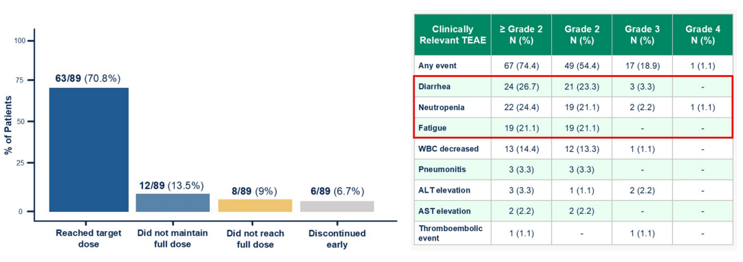 在安全性方面,达尔西利的不良反应基本上可控,主要毒副作用以骨髓抑制为主,腹泻和肝功能异常的发生率较低,且因不良反应导致治疗中断的比例也很低,因达尔西利停药的比例仅为2.6%。