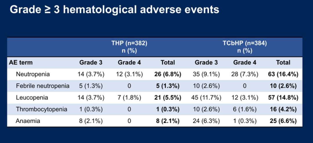 与TCbHP组相比,THP组患者的3-4级不良事件(79/382[20.7%]vs 133/384[34.6%])和严重不良事件(5/382[1.3%]vs 18/384[4.7%])较少。THP组最常见的3-4级不良事件为中性粒细胞减少(26/382[6.8%]vs TCbHP组的63/384[16.4%])、白细胞减少(21[5.5%]vs 57[14.8%])和腹泻(10[2.6%]vs 16[4.2%])。未发生与治疗相关的死亡。