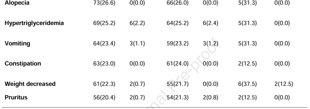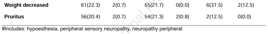该研究共纳入274例实体瘤患者,(0.33mg/kg,n=1;1.0mg/kg,n=3;1.25mg/kg,n=254;1.5mg/kg,n=16),包括51例UC,62例CC,49例EC,20例TNBC和92例其他实体瘤。安全性总体可控,1.5mg/kg组观察到1例DLT,为持续超过5天的4级中性粒细胞减少症,在所有剂量组中均未达到MTD,常见(≥20%)治疗相关不良事件(TRAE)详见表2。在1.25mg/kg剂量组中,3.9%的患者因TRAE导致治疗中止,22.0%患者因TRAE降低剂量,主要原因为中性粒细胞计数减少(7.1%)、白细胞计数减少(5.1%)、周围感觉神经毒性(4.7%)及皮疹(3.5%)。该组SAE发生率为27.6%,最常见的为中性粒细胞计数减少(5.9%)和白细胞计数减少(5.1%)。最终,研究确认1.25 mg/kg为推荐剂量。
