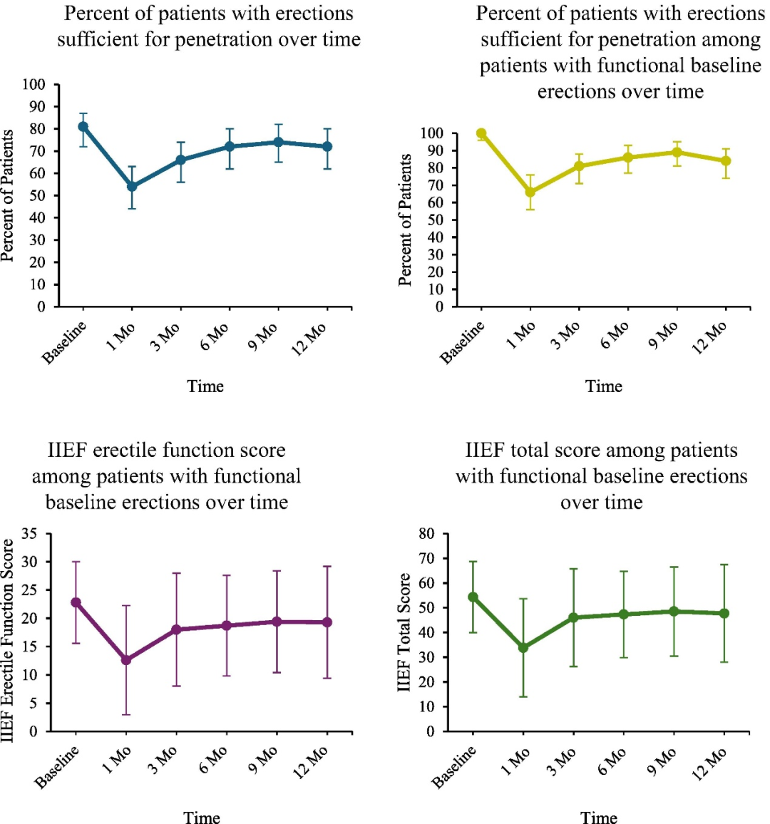 对于基线时功能性勃起的患者,IIEF-15评分在术后立即下降,但12个月时接近基线水平。除性欲外,所有子量表的评分下降均具有统计学意义。治疗前勃起功能良好的患者,基线时平均勃起功能评分为23分,12个月时为19分。基线时,81%的患者报告勃起足以进行插入(ESP)。