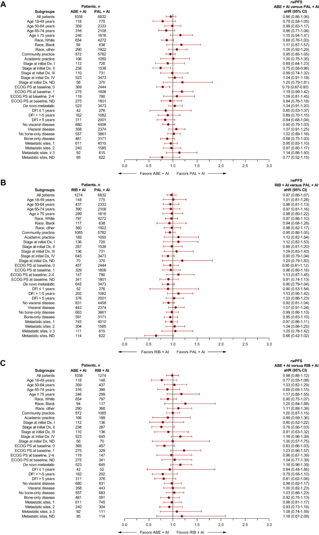 图4.经sIPTW后rwPFS亚组分析的森林图:(A)阿贝西利+AI vs哌柏西利+AI;(B)瑞波西利+AI vs哌柏西利+AI;(C)阿贝西利+AI vs瑞波西利+AI
