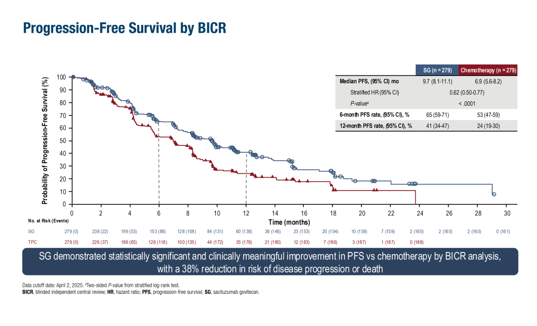在ASCENT-03试验中,共纳入558例不适合PD-(L)1抑制剂治疗的患者。与化疗相比,SG组的中位无进展生存期(PFS)显著延长(9.7个月vs 6.9个月;风险比<hr/>0.62;95%CI:0.50-0.77;P<0.0001)(LBA20)。中位随访13.2个月时,总生存期(OS)数据尚不成熟。客观缓解率(ORR)相似(48%vs 46%),但戈沙妥珠单抗的中位缓解持续时间长于化疗(12.2个月vs 7.2个月)。戈沙妥珠单抗组≥3级治疗中出现的不良事件发生率为66%,化疗组为62%。因治疗中出现的不良事件而停止治疗的患者比例,戈沙妥珠单抗组低于化疗组(4%vs 12%)。