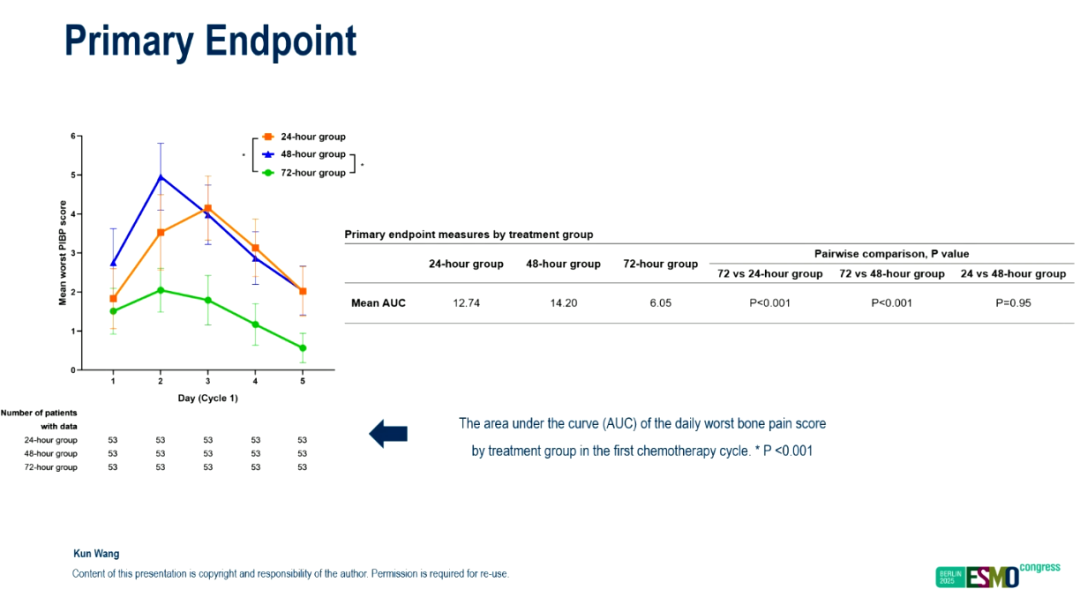 王坤教授:在该研究中我们入组的是1-3期的乳腺癌患者,这些患者有中高危的出现中性粒细胞下降的风险,他们按照1∶1∶1比例随机进入了24、48和72组。主要终点是首个化疗周期中连续五天每日最严重骨痛评分(0-10数字评分法)的曲线下面积。次要终点包括严重骨痛(NRS评分>5分)的发生率和持续时间,以及中性粒细胞减少症和发热性中性粒细胞减少症的发生率。