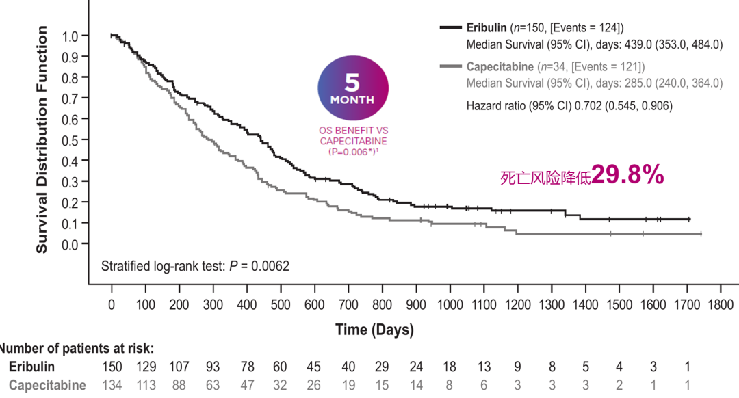 STUDY-301研究是对比艾立布林与卡培他滨的3期试验,入组患者为局部进展或转移性乳腺癌、至少经过蒽环及紫杉烷治疗(晚期为≤2线化疗)的乳腺癌患者(n=1102)。初次分析[2]显示在总体人群,艾立布林的生存获益可与卡培他滨相媲美。但随后的几次亚组分析[3,4]显示,相较于卡培他滨,艾立布林可显著延长TNBC亚组的中位OS达5个月(14.4 vs 9.4个月,HR0.702,P=0.006)、延长HER2阴性人群中位OS 2.6个月(16.1 vs 13.5个月,HR 0.77,P=0.026);且两组患者的总体TEAE无显著差异(94.0% vs 91.7%),而艾立布林的手足综合征发生率远低于卡培他滨(0.5% vs 48.3%)。非内脏转移分层分析显示,艾立布林比卡培他滨OS显著延长达9.5个月( 27.8m 对比18.3m ),死亡风险降低49%。
