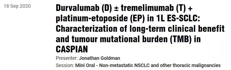 Durvalumab (D) ± Tremelimumab (T)+EP方案一线治疗广泛期小细胞肺癌患者长期获益与TMB疗效的关系:来自III期CASPIAN研究(摘要号:LBA86)