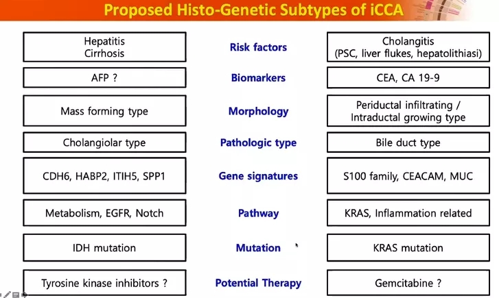 综合CCA的组织病理学和基因组特征,进一步提出组织遗传学(histo-genetic)的分型方法(图1),兼顾了胆管癌的组织病理特征和分子特征,具有更好的代表性。