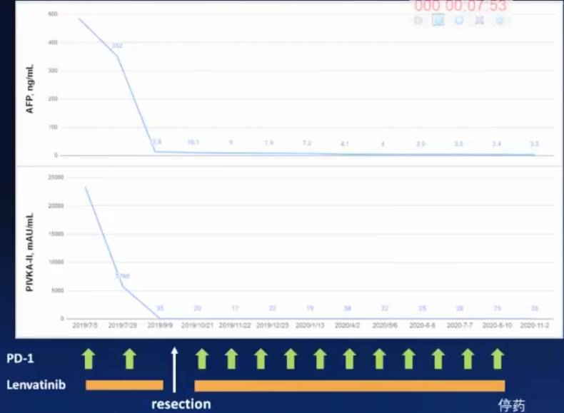 孙惠川教授介绍了一例系统治疗+外科治疗的临床真实案例,患者初诊为中国分期IIIa期(存在门脉癌栓,BCLC分期C期),未直接行手术治疗,初治方案为仑伐替尼+PD-1抑制剂,3个周期治疗后疗效评价PR,此后行右半肝切除术,术前和术后共使用12个周期免疫联合治疗后停药,随访至今仍未出现肿瘤标志物升高和影像学复发表现,无病生存(DFS)已达13.6个月,OS达到16个月,已超过抗血管生成药物一线治疗或直接手术的生存期。