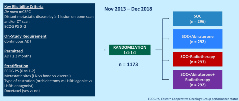 采用2x2析因设计的醋酸阿比特龙联合强的松和/或局部放疗治疗新诊断转移性去势敏感性前列腺癌(mCSPC)男性的3期研究:PEACE-1的首次结果