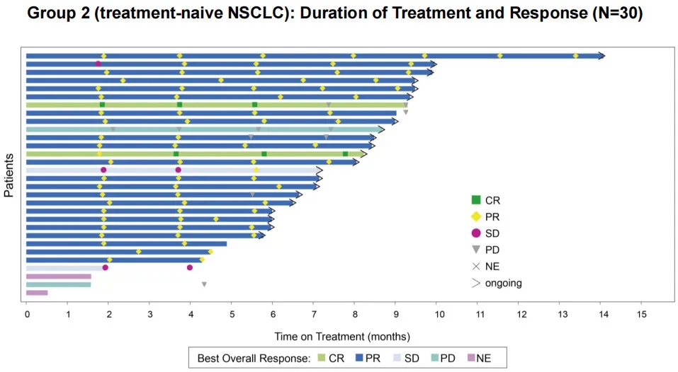 未接受既往治疗的患者:中位随访时间8.2个月,ORR达到80% (n=24;95% Cl: 61.4-92.3),其中6.7% (n=2) 获得CR,73.3% (n=22)患者经历了PR。中位治疗持续时间为7.13个月(0.5-14.0)。至首次应答的中位时间为1.87个月(1.7-3.8)。6个月和9个月DOR率分别为76.7%(95% Cl:55.6-97.8)和38.3%(95% Cl:0.0-92.5)。