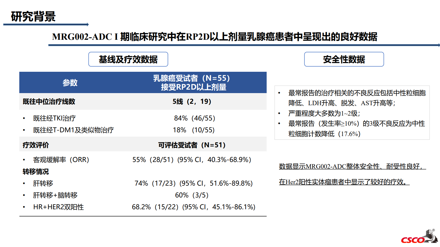 在此背景下,江泽飞教授回顾了由李进教授牵头的Ⅰ期临床研究中MRG002对多线治疗后HER2阳性乳腺癌患者的效果,截至2021年9月15日,Ⅰ期研究可评估的55例既往中位治疗5线HER2阳性乳腺癌患者,在接受RP2D(2.6mg/kg)以上剂量MRG002治疗后,ORR达到55%,肝转移、肝脑转移及HR阳性亚组均显示了较好的缓解,常见不良反应为中性粒细胞降低(17.6%),安全性可耐受。