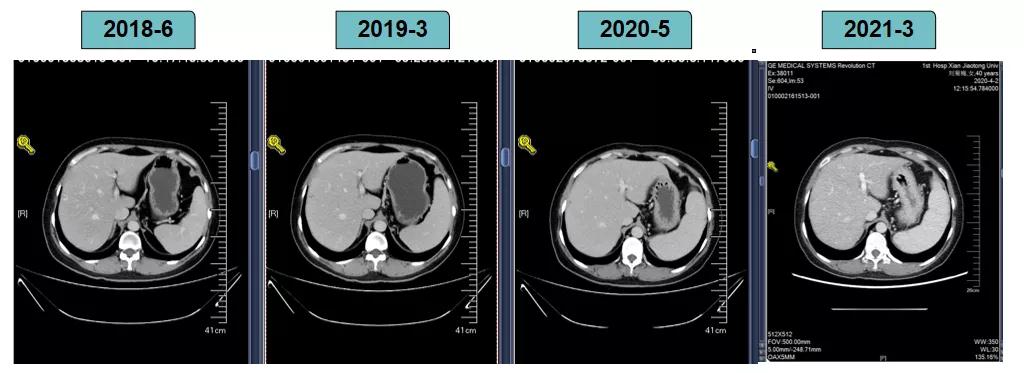 HER2阳性乳腺癌约占所有乳腺癌的20%~30%,既往研究结果提示,曲妥珠单抗辅助治疗经治的人群,有10%左右在停药一年内出现复发。本文中该例乳腺癌患者为39岁年轻女性,疾病分型为HER2过表达型乳腺癌,经TCbH新辅助治疗3周期后,疗效评价为PR。后行右乳癌改良根治术,根治术后分期为IIIc期,经过曲妥珠单抗辅助治疗结束4个月后出现疾病进展(卵巢内低分化腺癌),于2018年3月15日行卵巢转移瘤切除术,术后胸腹部增强CT发现肝脏、腹膜后淋巴结、纵隔淋巴结等多发转移。既往临床研究提示,对于曲妥珠单抗新辅助或辅助治疗后12个月内出现复发的原发耐药患者,应选用二线抗HER2方案治疗。后患者入组ELAINA研究,于2018-7-17开始接受T-DM1 3.6mg/kg(252mg)治疗至今,目前患者PFS近40个月。