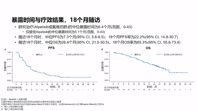 队列A随访18个月显示,mPFS 7.3个月、mOS 26.4个月、mPFS2为15.9个月;18个月PFS率为22.2%、OS率为65.3%,PFS2率为46.5%;临床获益率(CBR)45.5%;主要不良反应为腹泻、高血糖和皮疹,未见新发不良反应。该研究队列A数据为CDK4/6抑制剂+AI治疗进展后的HR+/HER2-、PIK3CA突变晚期乳腺癌患者提供了新的选择,PI3K抑制剂阿培利司联合氟维司群对PI3KCA突变患者显示了优秀的疗效。