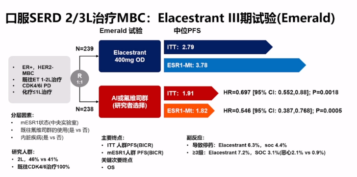 口服SERD药物依拉司群(Elacestrant)Ⅲ期试验Emerald研究同样探索了CDK4/6抑制剂治疗进展后的新的可能。对既往一、二线内分泌治疗、CDK4/6抑制剂治疗进展后患者,依拉司群较研究者选改善总体人群mPFS(2.79个月 vs 1.91个月 P=0.0018)以及ESR1突变患者mPFS(3.78个月 vs 1.82个月 P=0.0005),为患者带来依从性更好的用药选择。