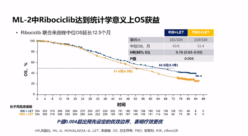 CDK4/6抑制剂的出现为HR阳性乳腺癌患者临床治疗带来了更多选择。在HR阳性晚期乳腺癌一线治疗方面,MONALEESA-2研究显示瑞博西利(ribociclib)联合来曲唑较安慰剂联合来曲唑可显著延长患者mOS 12.5个月(63个月vs 51.4个月 P=0.004);随着随访时间延长,瑞博西利组患者较对照组OS率差距不断扩大,6年OS率差距为12.2%(44.2% vs 32.0%);瑞博西利推迟首次化疗时间约1年(50.6个月 vs 38.9个月),可以更好的保障患者生存质量。该研究首次显示瑞博西利联合AI是有OS获益的一线方案,应考虑作为HR+/HER2-晚期乳腺癌的首选方案。