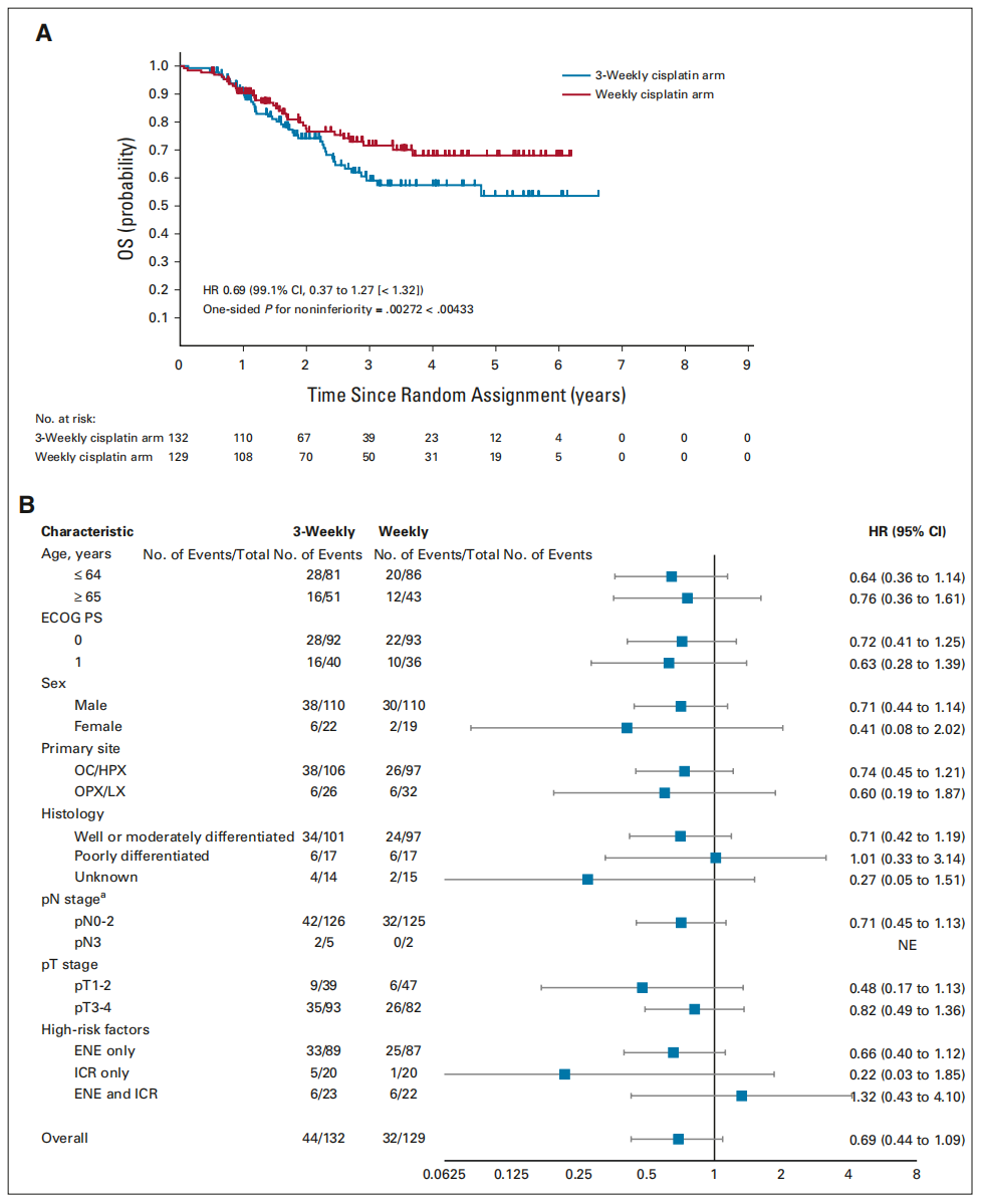 因此,日本学者进行了一项多中心的Ⅱ/Ⅲ期开放标签研究(JCOG1008),以探索对于术后高危LA-SCCHN患者,在总生存(OS)方面,每周40 mg/m2顺铂+放疗是否非劣效于3周100 mg/m2顺铂+化疗。