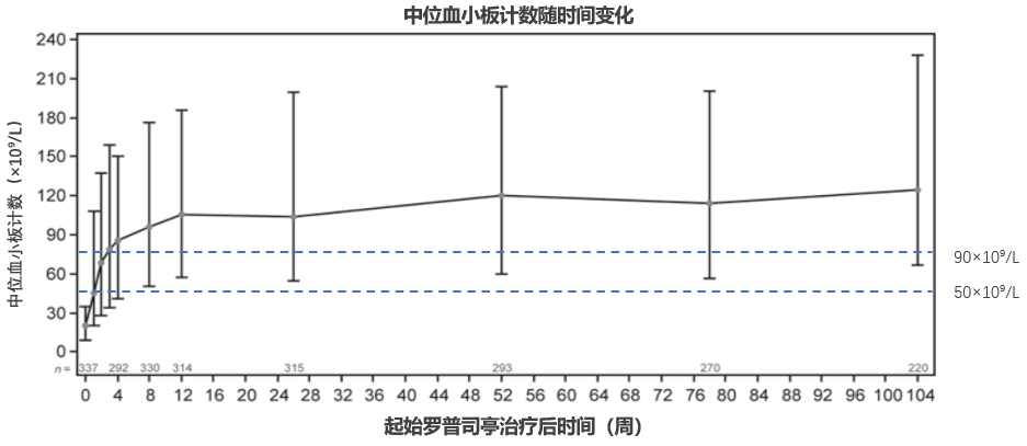 在欧洲开展的一项前瞻性研究中,纳入356例接受罗普司亭治疗的ITP患者,基线的血小板计数仅为20×109/L,但在罗普司亭治疗2周后,ITP患者的血小板快速显著上升,并且在此后的104周治疗期间中长期保持至50×109/L以上。