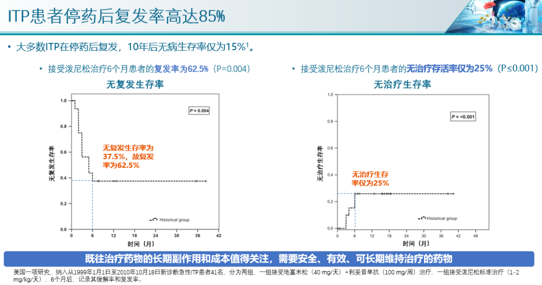 ②ITP患者的复发问题目前仍然非常棘手,有研究显示,基于糖皮质激素、重组人血小板生成素(rh-TPO)等ITP的一二线治疗的前提下,停药后大部分患者复发,10年生存率仅15%,见下图2。