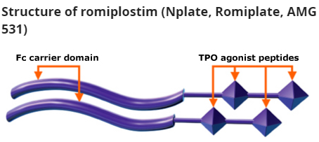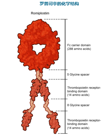 罗普司亭(romiplostim)是一种肽类TPO-RA,由2个经二硫键连接的人IgG1κ重链恒定区(Fc片段)构成,每个重链恒定区在第228位氨基酸残基处通过多聚甘氨酸与2条序列相同的肽共价结合。4个结合位点与天然TPO结合,它可快速安全地升高健康人、ITP患者和MDS患者的血小板计数,该药最早于2008年7月在澳大利亚上市,其后相继由FDA和EMA批准上市,用于免疫性血小板减少症的二线治疗。基于其良好的临床疗效,中国国家药监局(NMPA)官网于2022年1月11日公示,注射用罗普司亭(Romiplostim)在中国获批用于治疗免疫性血小板减少症(ITP),这将为糖皮质激素治疗不耐受或应答不佳的ITP患者提供了新选择。