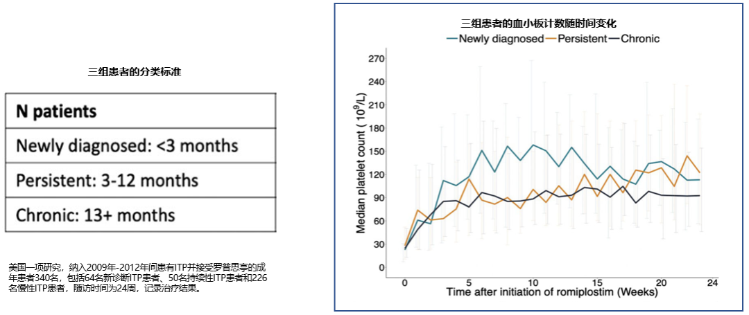在美国开展的一项研究中纳入了340例ITP患者,均应用罗普司亭治疗。结果显示,无论ITP患者的病程如何,在随访24周内,超过80%的ITP患者均在罗普司亭开始治疗后均快速升高血小板。