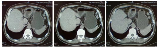 治疗后观察:治疗4周期后,疗效评估cCR;患者无明显发热,体重无明显降低,嗳气、上腹部不适症状好转。胃肠反应Ⅰ度,骨髓抑制Ⅰ度。