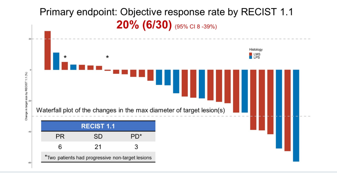 截至2021年11月15日,30名患者(F/M 20/10)接受了至少一个周期的L+E治疗;21例为LMS(9例为子宫型,12例为非子宫型),9例为LPS(5例为去分化型,2例为粘液样圆形细胞,2例为多形性)。入组前接受治疗的中位线数为1(范围0-3)。RECIST 1.1评估的ORR为20%(6/30)(95%CI:10-53%);每天接受18mg仑伐替尼(2/6)和14mg仑伐替尼(4/26)的ORR没有显著差异(P=0.23)。中位随访时间为20.1个月后,中位PFS为8.56个月(95%CI:4.40-NR),6个月PFS率为59%。LMS(8.56个月,95%CI:4.17-NR)和LPS(11.36个月,95%CI:4.4-NR)的中位PFS没有显著差异(P=0.73)。中位OS为26.2个月(95%CI:21.4-NR),12个月OS率为89%,但LPS患者的OS明显更差(HR 3.5,P=0.04)。