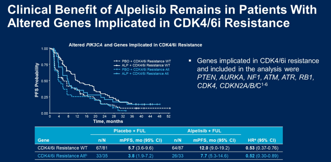 在MAPK通路改变(HR 0.43)、PI3K通路改变(HR 0.68)以及CDK4/6i耐药基因突变(HR 0.52)且同时携带PI3KCA突变患者中均可以看到alpelisib+氟维司群治疗的PFS获益。