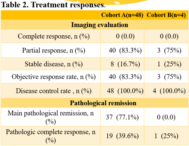 2022年9月26~28日,国际食管疾病学会(ISDE)第十八届世界大会以虚拟会议形式举行,该研究的优秀研究成果再次被收录于此次大会。截至2022年4月21日,队列A共纳入62例局晚期食管癌患者,其中,48位经免疫联合新辅助化疗治疗后,进行了手术切除,这些患者中,pCR达39.6%(19/48),MPR 77.1%(37/48),降期率91.7%(44/48),均为R0切除(100%),术前影像学评估ORR达83.3%(40/48);91.9%(57/62)的患者出现任意级别AEs,14.5%(9/62)的患者出现3级及以上AEs,最常见的治疗相关不良事件是贫血(64.5%,40/62)、低白蛋白血症(24.2%,15/62)、血乳酸脱氢酶升高(22.6%,14/62)和中性粒细胞减少(27.5%,17/55)。整体安全性良好。
