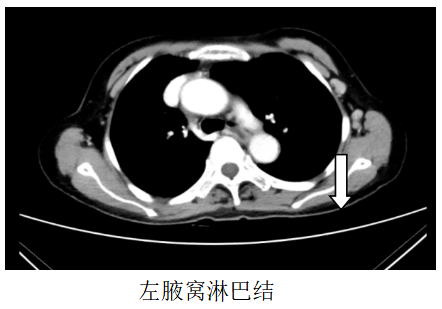 胸部CT:1、左锁骨区、左腋窝多发肿大淋巴结,考虑转移,建议随访,全腹CT:考虑食管胃交界癌累及胃周脂肪并腹腔腹膜后淋巴结多发转移(CT分期约T4aN3)。