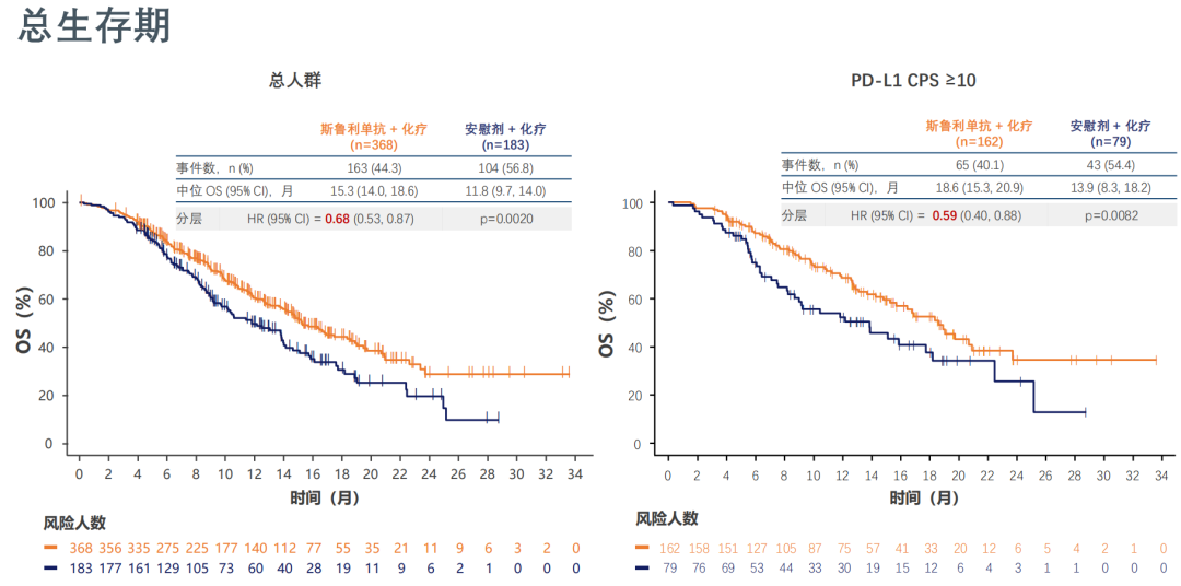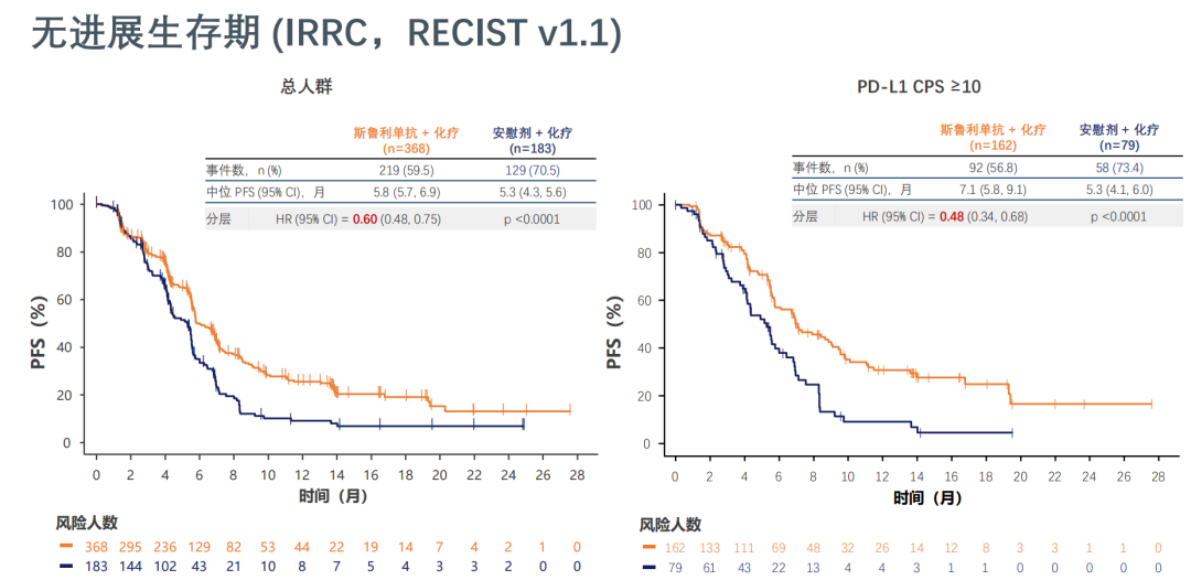主要终点方面,斯鲁利单抗联合化疗组的中位PFS(由IRRC据RECISTv1.1评估)和中位OS均较安慰剂联合化疗组显著延长,CPS≥10人群获益更大。两组总人群中位OS分别为15.3个月vs11.8个月(HR=0.68,P=0.0020),死亡风险降低32%;CPS≥10人群中位OS分别为18.6个月vs13.9个月(HR=0.59,P=0.0082),死亡风险降低41%(图2)。两组总人群中位PFS分别为5.8个月vs5.3个月(HR=0.60,P<0.0001),疾病进展风险降低40%;CPS≥10人群中位PFS分别为7.1mvs5.3m(HR=0.48,P<0.0001),疾病进展风险降低52%(图3)。