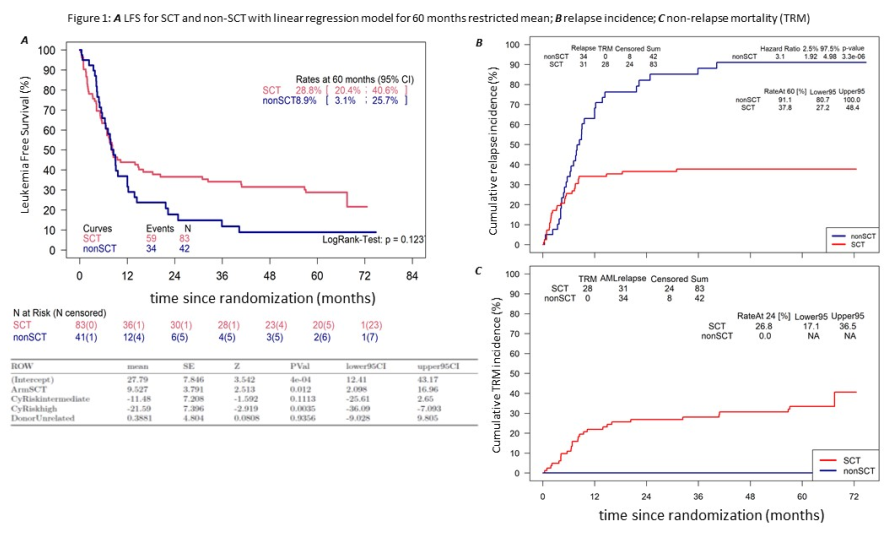 60-75岁新诊断的AML患者,诱导治疗达到CR1时开始供体搜索。一次巩固治疗后,患者接受细胞遗传学/分子学和合并症评估,具有相关或不相关供体的患者随机分入SCT或非SCT(2:1)巩固治疗。氟达拉滨/200cGy全身放疗和环孢素/霉酚酸酯(Hegenbart U等,JCO 2006)预处理后进行SCT。非SCT巩固治疗根据当地习惯进行。主要终点为无白血病生存(LFS),次要终点包括累积复发率(RI)、治疗相关死亡率(TRM)、总生存(OS)和并发症[包括移植物抗宿主病(GVHD)]。计划的首次中期分析中,共有78例患者数据,LFS明显低于预期,比例风险假设显然错误。最初的样本量目标n=231,重置为n=150。统计分析5年内限定性平均(RM)-LFS的差异,分析遵循意向治疗原则。