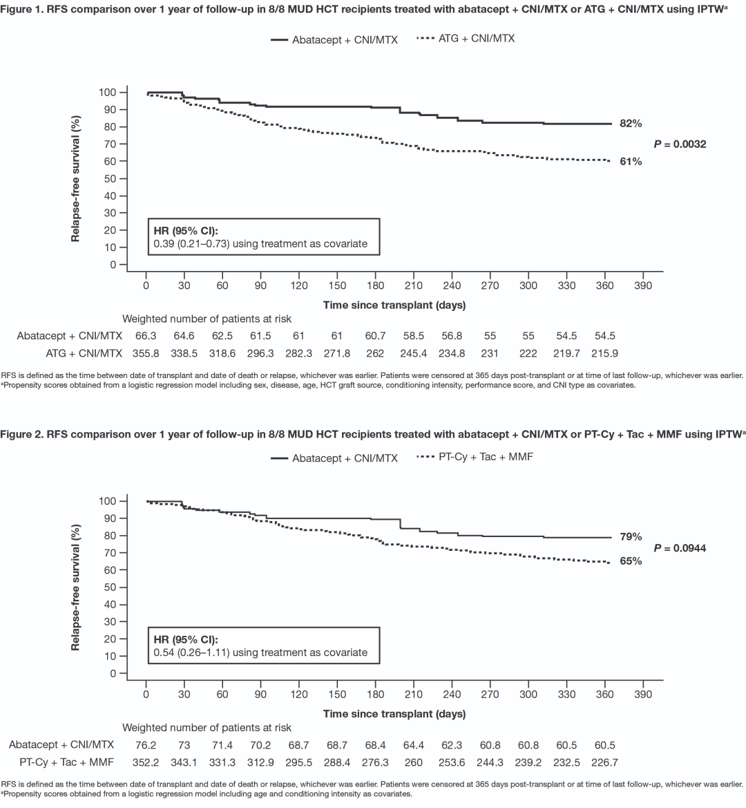 这项回顾性队列研究纳入的是CIBMTR数据库中同种异体HCT受体,需接受ABA+CNI/MTX、ATG+CNI/MTX和PT-Cy+Tac+MMF(PT-Cy)治疗。受体≥6岁,体重≥20kg,Karnofsky/Lansky评分≥80%,诊断为白血病、淋巴瘤或骨髓增生异常综合征,于2011年至2018年期间在美国接受了首次同种异体7/8 MMUD或8/8 MUD HCT。HCT后1年评估总生存率(OS;HCT日期与记录的死亡日期之间)和无复发生存率(RFS;HCT日期与死亡或复发日期之间,以先发生者为准)。使用加权对数秩检验,利用倾向评分计算控制治疗偏倚,采用治疗加权逆向概率(IPTW)比较结果。加权Cox比例风险模型预估边际风险比(HR)和95%CIs,治疗为协变量。