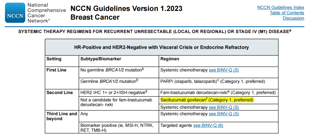 基于TROPiCS-02、ASCENT关键3期临床研究的出色结果,在新近发布的2023年第1版NCCN乳腺癌临床实践指南中,新增戈沙妥珠单抗作为HR+/HER2-内脏危象或内分泌治疗复发患者二线治疗的I类首选方案;同时、仍作为不可切除或转移性三阴性乳腺癌(TNBC)患者二线治疗的I类首选方案[3]