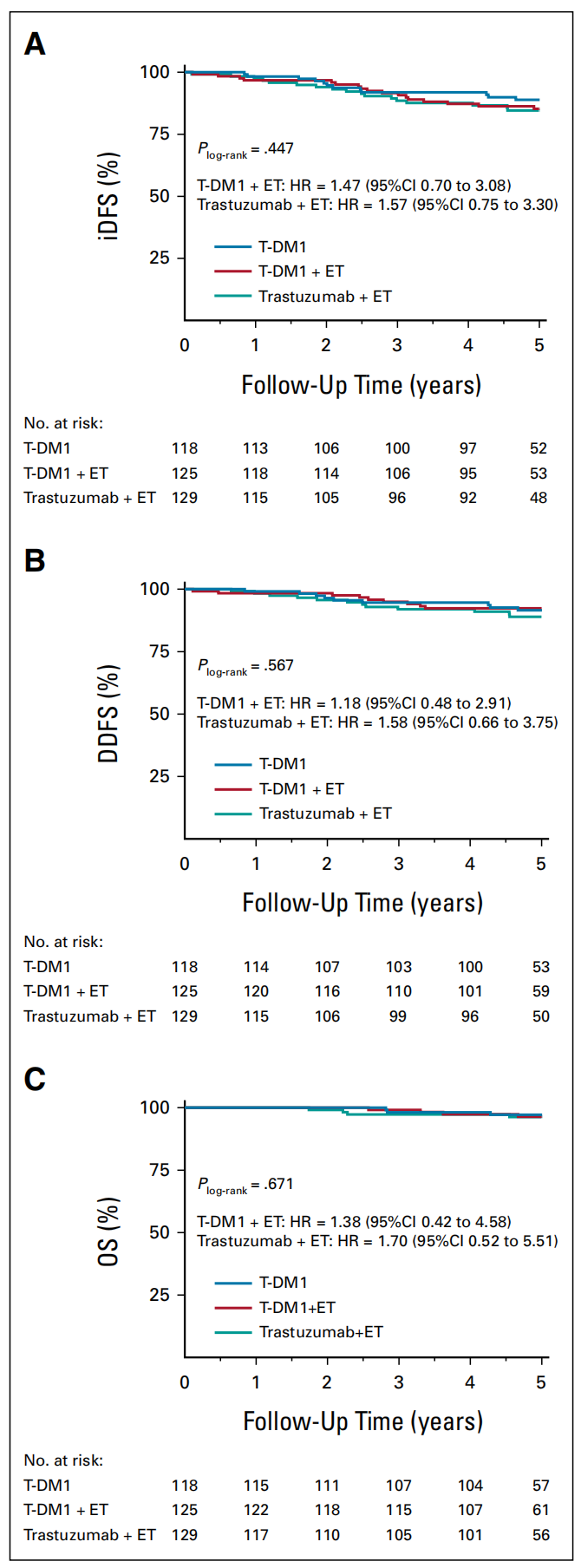 (2)各治疗组之间的五年iDFS率是相当的(T-DM1组:88.9%;T-DM1+ET组:85.3%;曲妥珠+ET组:84.6%)。不管是否依据pCR、雌激素受体状态、年龄和组织学分级调整的iDFS在各治疗组之间没有显著差异。同样,就5年DDFS率和OS率而言,各治疗组之间没有显著差异。