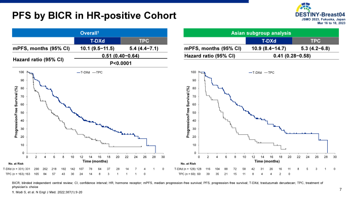 在HR+患者中,亚洲亚组的T-DXd组中位PFS相较于TPC治疗延长了5.6个月(10.9 vs 5.3个月),与整体获益一致(10.1 vs 5.4个月)。亚洲亚组的疾病进展或死亡风险显著降低59%(HR 0.41,95%CI:0.28~0.58)。