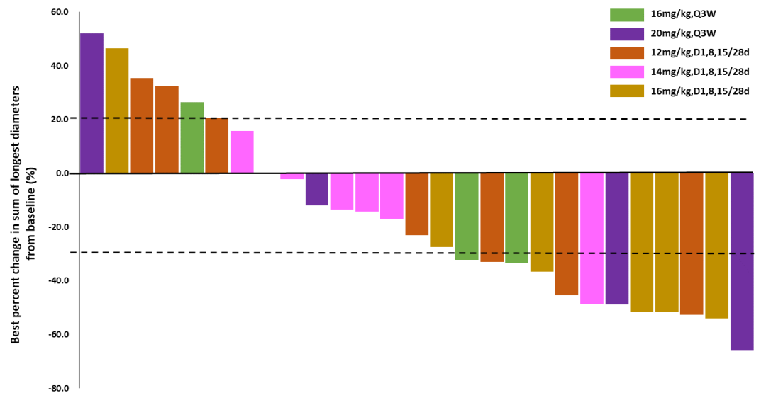 图1.有效剂量组受试者靶病灶较基线的最佳变化百分比(%)