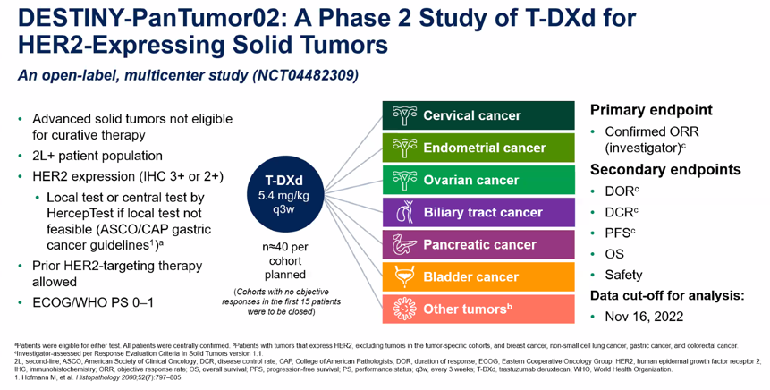 DESTINY-PanTumor02(DPT-02)是一项全球性、多中心、开放标签II期临床研究,旨在评估Enhertu(5.4mg/kg,q3w)治疗HER2表达阳性肿瘤的疗效和安全性,该研究分为7个队列,包括胆道癌、尿路上皮癌、宫颈癌、子宫内膜癌、卵巢癌、胰腺癌和其他肿瘤等,纳入的患者既往经过≥2线治疗,且HER2表达为IHC 2+或3+(允许既往经过针对HER2靶点的治疗)。