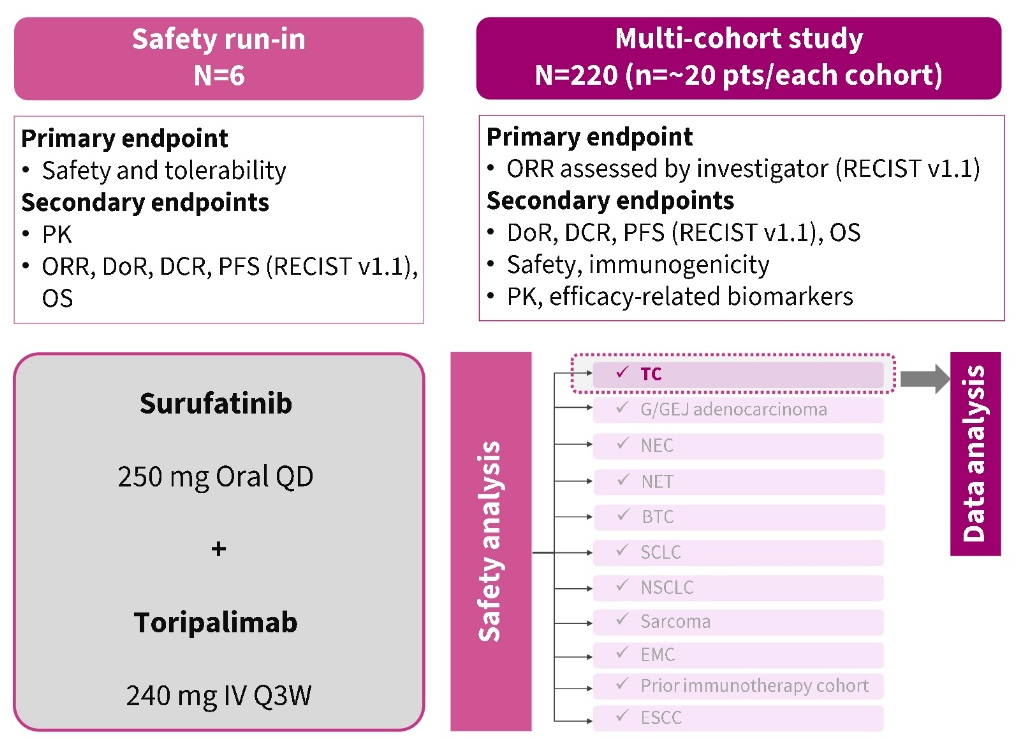 放射性碘难治性分化型甲状腺癌(RAIR-DTC)患者的治疗难度大,且长期预后不佳。本研究为一项开放标签、多队列、单臂Ⅱ期研究,纳入不适合手术或外放射放疗的局部晚期或转移性RAIR-DTC患者,并且治疗前12个月内疾病进展,自上次放射性碘治疗后≥6个月。入组患者接受口服索凡替尼(一种VEGFR1-3、FGFR1和CSF-1R的小分子抑制剂)250 mg QD,联合静脉注射特瑞普利单抗(一种抗PD-1抗体)240 mg Q3W,直至疾病进展或达到特瑞普利单抗最长治疗持续时间24个月,或其他方案规定的标准。主要终点是客观反应率(ORR)。