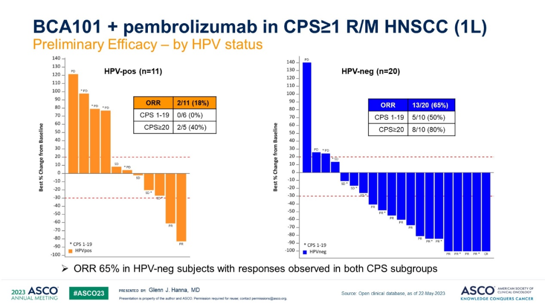 此外,我比较感兴趣的是TGF-β/EGFR药物,它在HPV阴性患者中达到65%的客观缓解率,而在HPV阳性患者客观缓解率仅为18%。这项研究可能支持在治疗较为困难的HPV阴性头颈鳞癌患者(不仅包括口咽癌,还包括口腔、喉、下咽等部位肿瘤)中,对该药物进行进一步探索。我们也会持续关注头颈鳞癌研究的最新进展,期待未来能够造福更多患者。