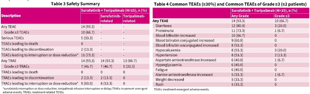 从2020年3月到2021年11月,共入组15例患者,中位治疗持续时间为11.1个月,中位年龄为61岁(范围:37-74岁)。9例(60%)患者为男性,12例(80%)患有乳头状甲状腺癌。在13例PD-L1免疫化疗结果中,6例患者的PD-L1 CPS≥1%。截至2022年12月28日,中位随访时间为22.11个月。在至少接受过1次基线后肿瘤评估的15例患者中,ORR为33.3%(5例PR),DCR为93.3%。mDoR为8.34个月。mPFS为10.91个月(95%CI;4.01-NA)。未达到mOS,12个月的OS率为100%。治疗期间的不良事件(TEAE)共有14例(93.3%),≥3级TEAE为10例(66.7%),最常见(≥10%)TEAE为低钙血症(20%)、腹泻(20%)和高血压(13%)。无TEAE相关死亡事件。