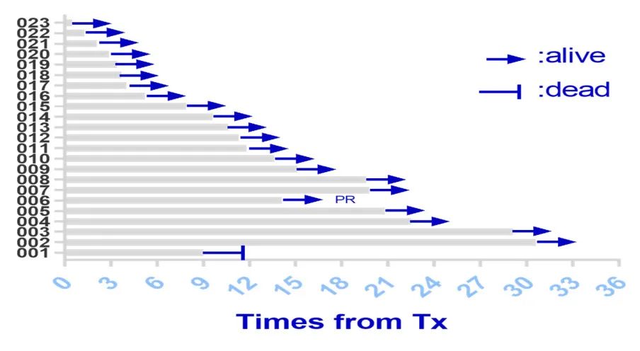 安全性数据:最常见的不良反应是血液学毒性,如3-4级中性粒细胞减少(15/23)、贫血(5/23)、血小板减少(5/23)等。大部分非血液学毒性发生第一周期,包括:乏力(13/23),感染(10/23),输液反应(11/23),纳差(13/23)等。