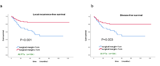 无论是总体人群还是交界性亚型或恶性亚型人群,手术切缘≥1cm患者的LRFS率及DFS率均明显高于手术切缘<1厘米的患者(见图1、2、3)。