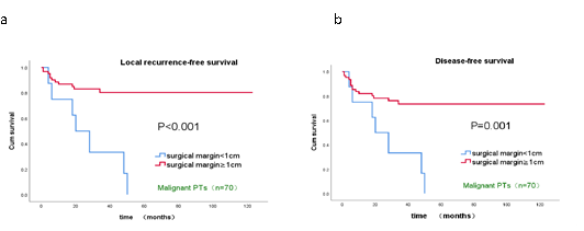 研究结论:不论交界性还是恶性叶状肿瘤,手术切缘≥1cm可以获得更好的预后。年龄<45岁的患者局部复发风险高,肿瘤较大的患者预后差,这些高危患者可能需要多种治疗方式。