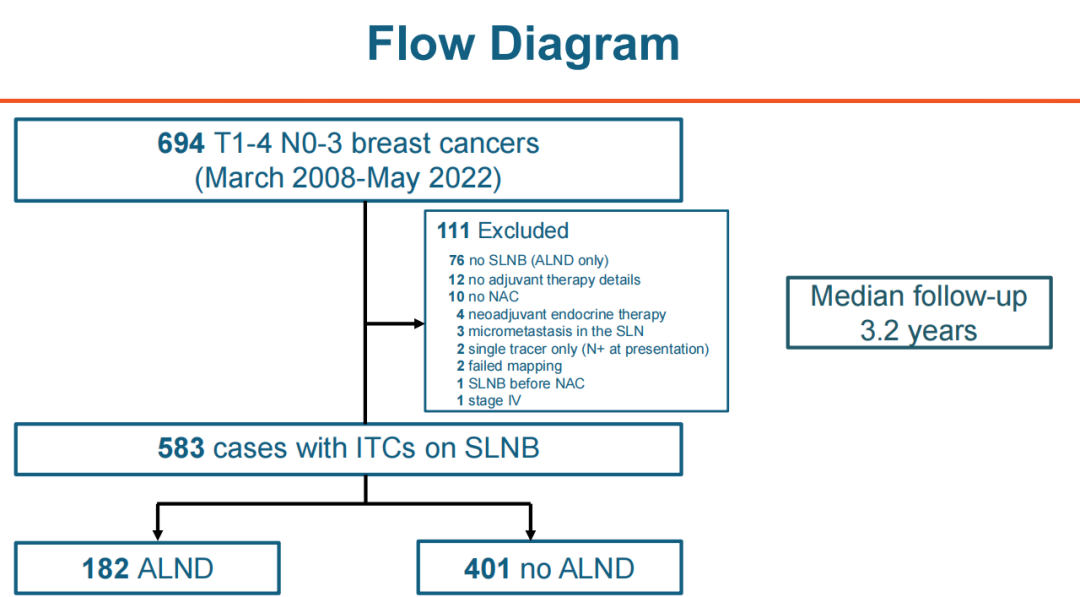 OPBC05/EUBREAST-14R/ICARO(以下简称EUBREAST-14R)是一项欧洲的多中心回顾性研究。试图评估发现额外阳性淋巴结的频率,确定与ALND相关的因素,并比较在SLN中残留ITCs后,接受ALND患者和不接受ALND患者的肿瘤预后。研究者从42个中心收集了数据,其中20个来自肿瘤整形乳腺联盟(OPBC)和欧洲乳腺整形联盟(EUBREAST)网络,22个来自北美和南美。纳入了确诊时为cT1-4N0-3的患者,这些患者接受NAC后通过SLN活检(SLNB)或靶向腋窝清扫(TAD)进行腋窝分期,以发现有残留ITC[ypN0(i+)]的乳腺癌患者。cN0患者允许进行单示踪剂绘图检测,而cN+患者需要进行双示踪剂绘图检测或TAD。腋窝治疗包括完成ALND和/或淋巴结放疗(RT)。进行竞争风险分析以评估腋窝复发(AR)、局部复发(LRR)和任何侵袭性(局部或远处)复发的累积发病率。研究人员比较了接受ALND的患者和未使用Gray’s检验的患者5年累积发病率。