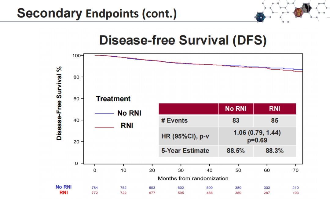 NSABP B-51试验入组了NAC前cT1-3N1M0、NAC后经前哨淋巴结活检(SLNB)或ALND后判断为ypN0的患者,并对其进行随机分组,如果采用保乳治疗,则随机分配到全乳放疗组和全乳+区域淋巴结放疗(RNI)组;如果患者采用全乳房切除手术,则随机分为乳房切除术后放疗(PMRT)+RNI组和无术后放疗组。NSABP B-51试验主要研究终点无浸润性乳腺癌复发间期(IBC-RFI),次要终点包括无局部复发间期(LRRFI)、无远处复发间期(DRFI)、无病生存期(DFS)和总生存期(OS)。