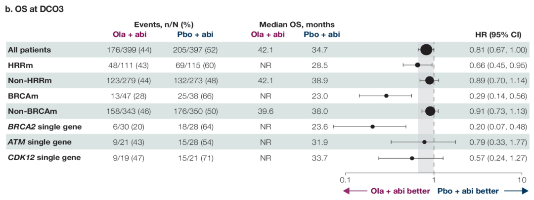 本次ASCO-GU大会报道了该研究HRRm人群的详细数据:总体上有28.4%的患者携带HRRm,非HRR突变以及不同HRR突变基因患者的rPFS均有一致获益。OS是大家较为关注的结果,在常见的HRR突变类型(BRCA2、ATM、CDK12)中,也都显示有利于奥拉帕利的生存获益优势,其中BRCA2突变患者的rPFS和OS HR仅为0.20;ATM突变患者的rPFS和OS HR为0.55和0.79;CDK12突变患者的rPFS和OS HR为0.51和0.57。